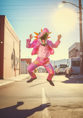 Generative AI : Female wearing vibrant unicorn mask jumping against wall