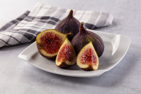 Ripe, beautiful, purple figs. Sweet and juicy. Mediterranean fruit is very healthy. On a light gray background copyspace there is an empty place. Food for vegetarians.