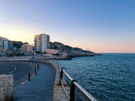 Beautiful sunrise view of Alicante Postiguet beach and castle Santa Barbara in Spain Valencian Community