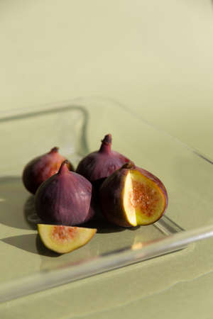 Ripe sweet sliced figs on a plate on a light green background. Healthy Mediterranean figs.