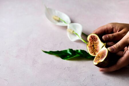 Hand holding a fresh whole and cut figs with some flowers on a light pink marbled background, copy space. Selected focus