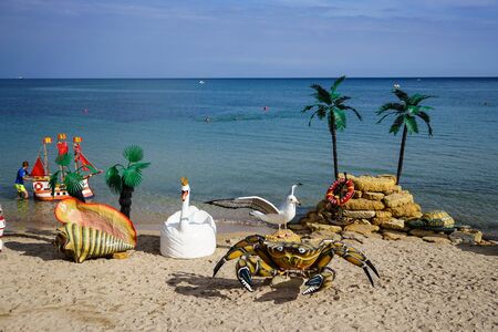 Evpatoria, Crimea-June 20, 2015: City beach with various figures for commercial photography against the sea and people.