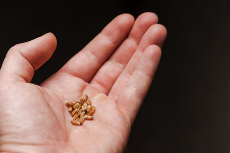 Close up of cereal seeds in male hand on black background