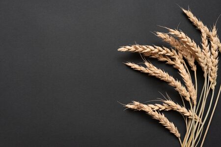 agriculture wheat spread on dark background, copy space