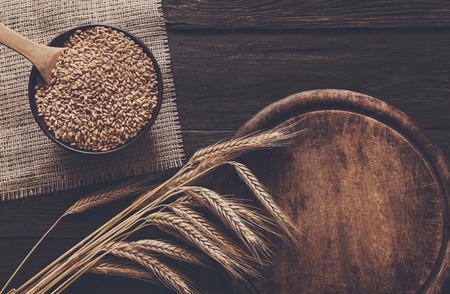 Bread baking background. Grain and ears scattered around on rustic wood near round wooden desk. Agricultural wheat harvest, bread making composition