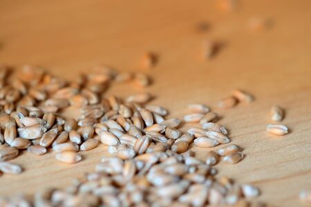 Wheat grains scattered on a wooden surface close-up. Toned background