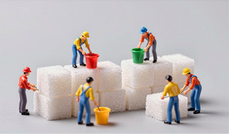 Small figurines dressed as workers are engaged in constructing a structure from sugar cubes. The scene is playful, showcasing a mix of colors with tools and buckets.