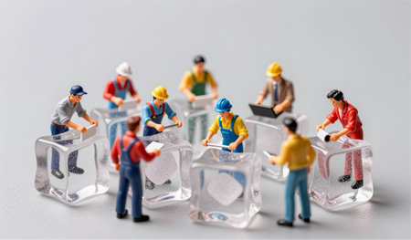 Tiny figurines in colorful outfits are hard at work, constructing and managing tasks on clear ice cubes. This scene captures a whimsical blend of labor and creativity, set against a simple backdrop.