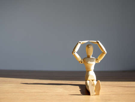 Wooden model of a man in warm sunlight. Space for your inscription. COVID-19 Pandemic Coronavirus and business concept. Copy space.
