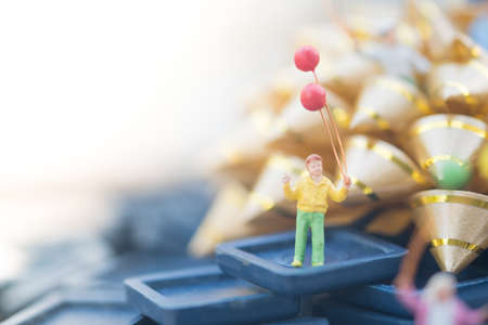 Miniature people : Happy young boy holding balloon on the park with gold bokeh background, Concept of happy and leisure time