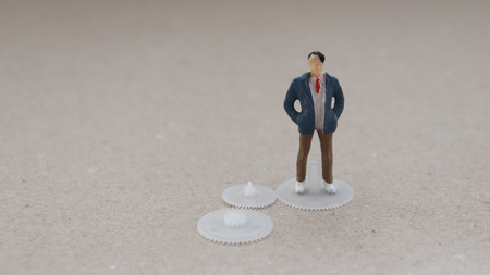 A miniature man standing on a clockwork.
