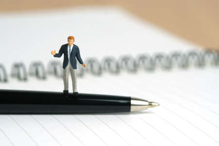 Miniature people toy figure photography. Signing agreement concept. A shrugging businessman stand above a black pen and opened document on wooden desk. Image photo