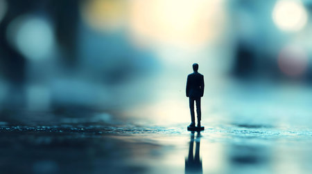 A small figurine of a man stands alone, his reflection mirrored on a dark surface. The image evokes a sense of contemplation and solitude.
