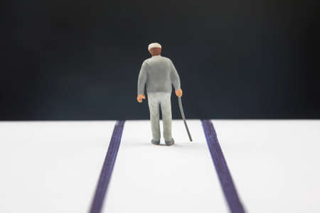 miniature people. an elderly pensioner with a stick walks the road until the end of his life. loneliness and depression