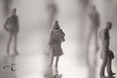 a group of miniature people in relation to each other on a colored surface