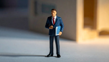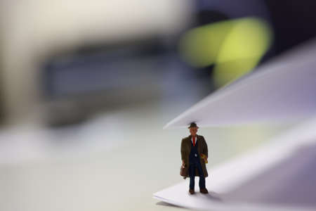 Miniature tiny people toy figure photography. A businessman standing alone with spotlight on dark room., shelf doubt dan introspection concept. Image photo