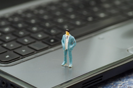 Miniature businessman walking on the laptop