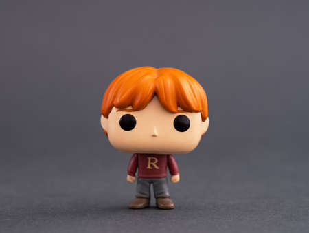 Tambov, Russian Federation - February 15, 2022 A Ron Weasley Funko POP Mini Vinyl Figure on gray background. Harry Potter Advent Calendar.