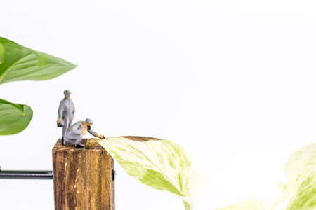 Miniature people : Close up workers work on Epipremnum aureum (Golden pothos) isolated on white background