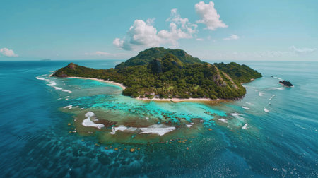 A tranquil tropical island showcases vibrant greenery with clear blue waters reflecting a magnificent sky, creating a serene atmosphere perfect for relaxation.