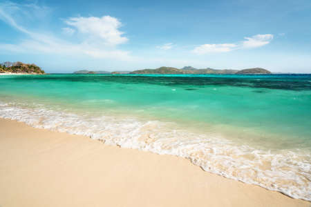 Tropical Malcapuya island with sea foam, azure water and white sand beach. Travel vacation at Philippines.