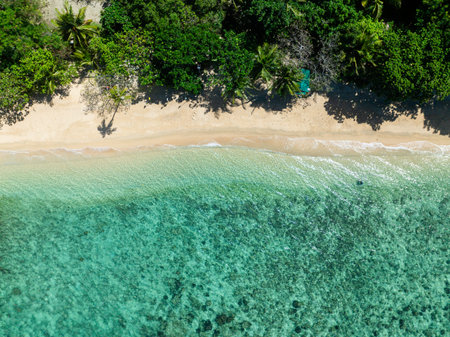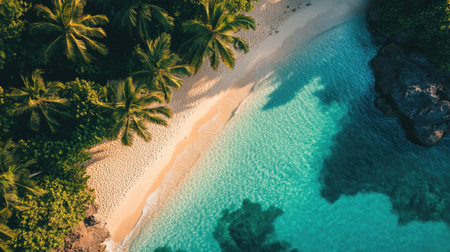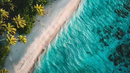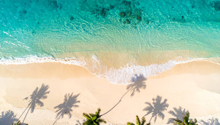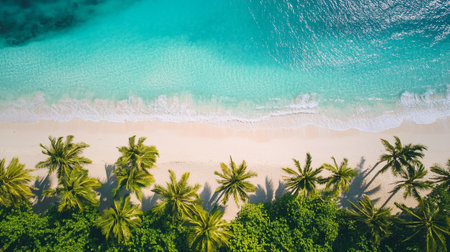 Stunning aerial view of a tranquil tropical beach featuring crystal clear turquoise water, soft sand, and swaying palm trees. Ideal for travel themes.