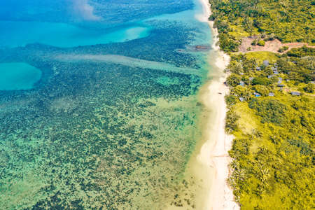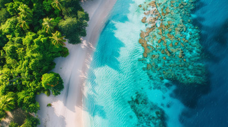 Aerial view of beautiful coral reef on tropical island with sandy beach and turquoise ocean.