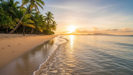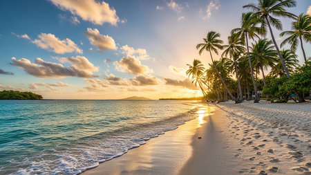 A picturesque tropical beach with palm trees casting long shadows on the white sand, and a clear blue ocean with gentle waves lapping at the shore.