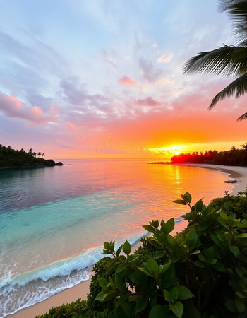 A stunning sunset casts a warm glow over a tropical beach lined with palm trees. The tranquil waters reflect the vibrant colors of the sky, creating a serene atmosphere perfect for relaxation.