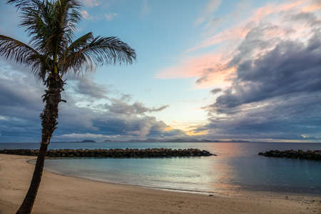 Beach and palm tree in sunset. Stormy dark clouds in the background.