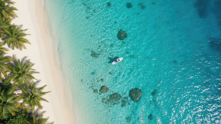 An overhead perspective reveals a tropical beach scene, showcasing clear turquoise water meeting a sandy shore. A paddleboarder navigates the calm waters, while lush palm trees line the beach. The composition utilizes natural lighting and evokes a sense of tranquility. Ideal for travel, vacation, or environmental content.