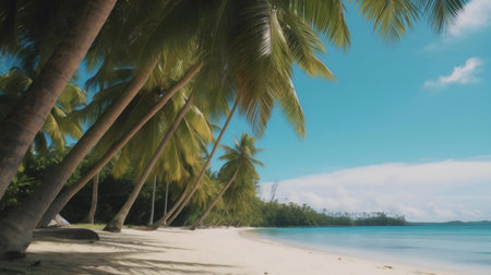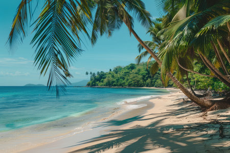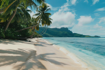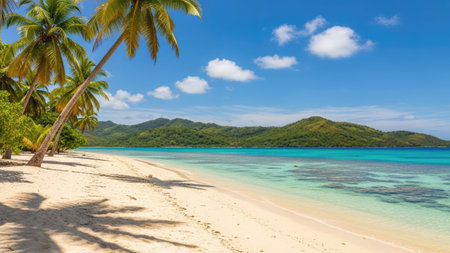 A scenic view captures a pristine sandy beach framed by lush palm trees. Turquoise waters meet the shore under a bright blue sky dotted with clouds. Rolling green hills in the distance add depth to this outdoor setting. This image is suitable for various commercial purposes.