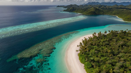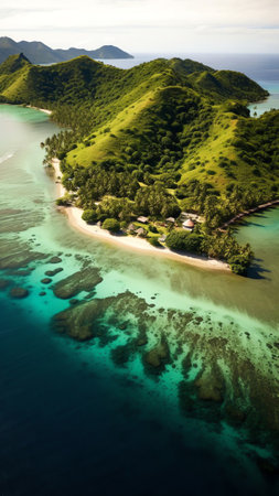 Fiji islands: Aerial view capturing a lush tropical island in Fiji, where a vibrant coral reef meets a pristine coastline lined with palm trees. Wild nature travel landscape. Drone flight