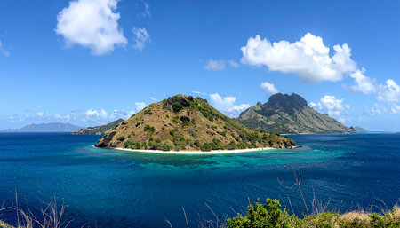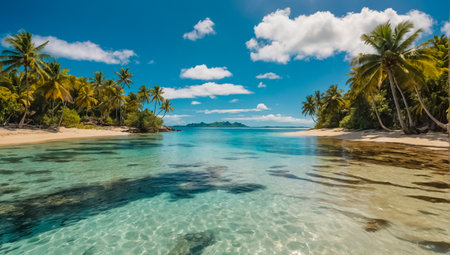 Tropical island paradise with white sand beach and turquoise waters awaiting relaxation