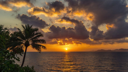 Colorful sunset on the ocean. Sunset meetings at the beach. Tropical sunset with palm trees.
