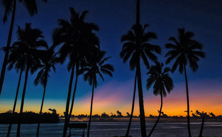 A scenic sunset illuminates a coastal environment featuring palm trees and a tranquil ocean. The sky showcases vibrant orange and blue hues with the silhouetted palm trees creating a stark contrast. This image could be used for travel, tourism, or environmental themes.