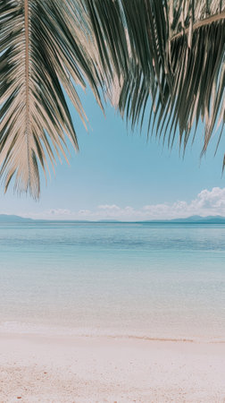 Tranquil tropical beach scene with crystal clear turquoise water gently lapping the shore, framed by lush green palm leaves, evoking a sense of peaceful paradise