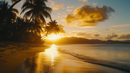 Awe-inspiring view of a tranquil tropical beach at sunrise, featuring palm trees and a vibrant sky reflected in calm waters. A perfect nature escape.