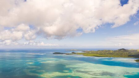 Islands are surrounded by an atoll and a coral reef with blue water top view. Bucas grande, Philippines. Summer and travel vacation concept.