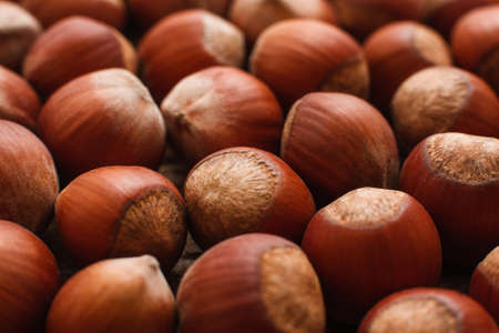 Brown background of hazelnuts close-up. Macro picture of pile of filbert nuts, bright autumn background. Harvest, fall, food ingredient concept