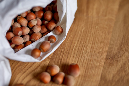 Scattered hazelnuts on a wooden table in warm afternoon light