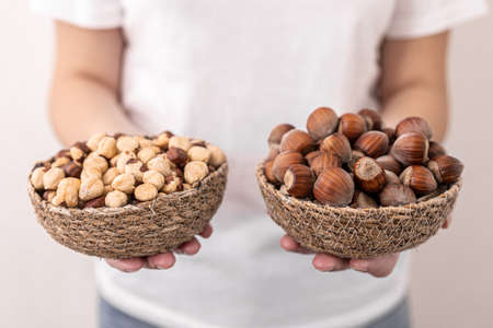 Close-up of a plate of hazelnuts and macadamia nuts in female hands.