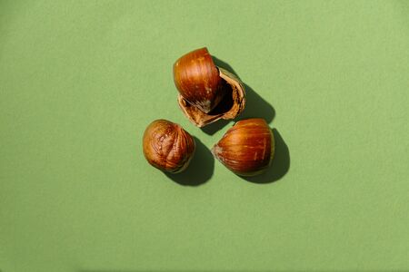 Hazelnuts on Green. A small pile of hazelnuts laid on a green background.