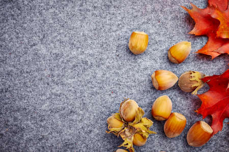 Hazelnuts in a bowl with leaves. autumn background