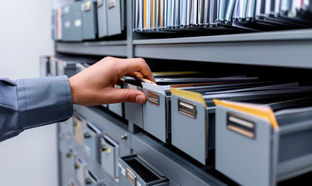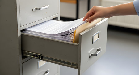A person is carefully sorting and filing sheets of paper into a cabinet. The workspace is organized and reflects a diligent effort to maintain order among important documents.