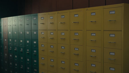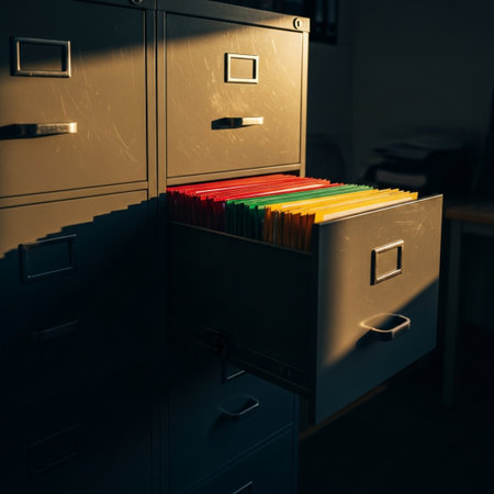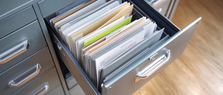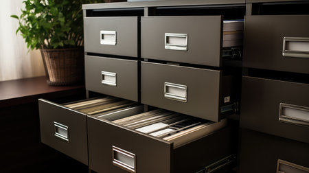 Close-up perspective of open drawers in a sleek filing cabinet, revealing neatly arranged documents.