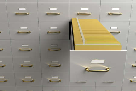 Office filing cabinets with open drawer background. Document data archive storage and business administration concept. 3d illustration