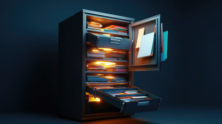 Discover an intricately rendered open filing cabinet brimming with colorful documents, showing a blend of organization and creativity against a minimalist backdrop.