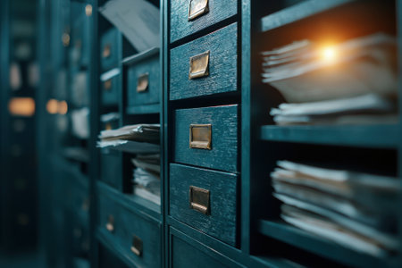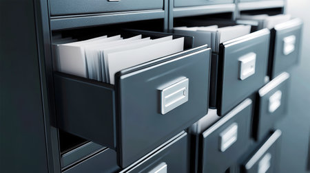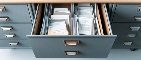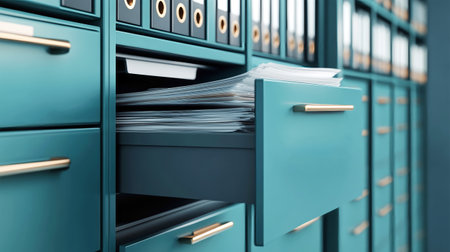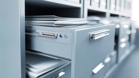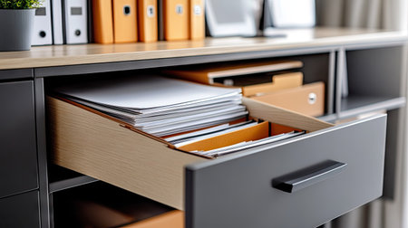 Close-up view of open drawers in a sleek filing cabinet displays an array of neatly stacked documents, reflecting a tidy workspace filled with organization.