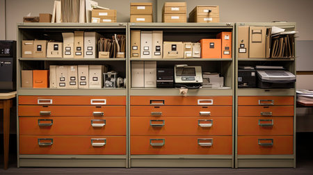 File cabinet with a wide open drawer full of files. Generative AI illustration